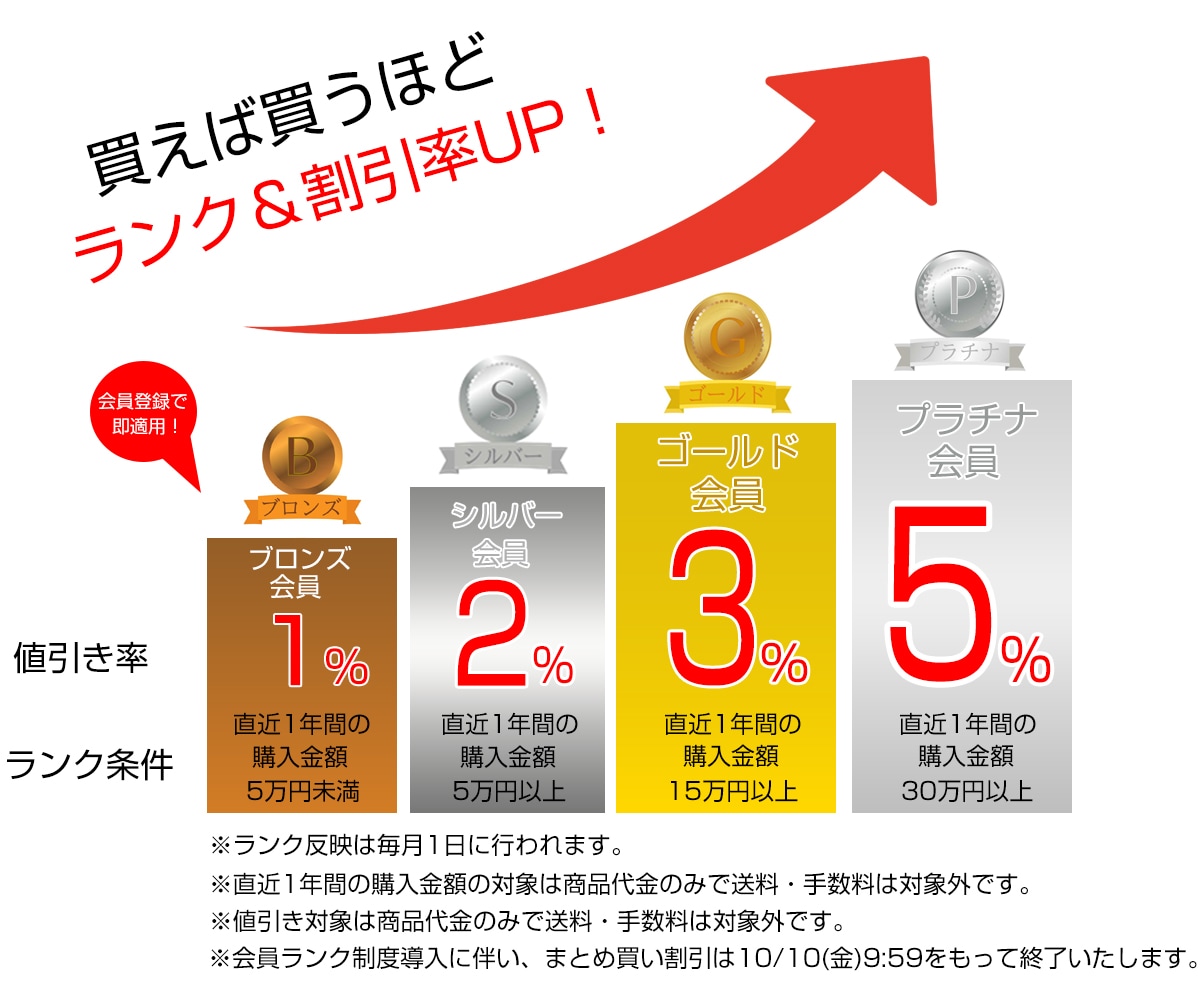 会員ランク制度の導入に伴い、まとめ買い割引(同一商品を3つ以上ご注文で商品代金の5%を割引)は2025年10月10日(金)9時59分をもって終了いたします。